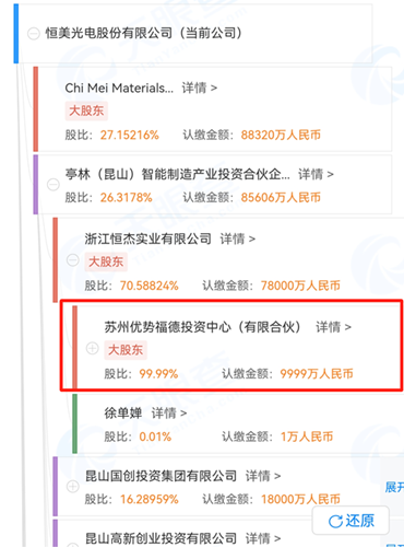 这边,亭林昆山为恒美光电第二大股东,其持股比例仅低于奇美新材料不到1个百分点。股权穿透后,亭林昆山实控人为优势福德。