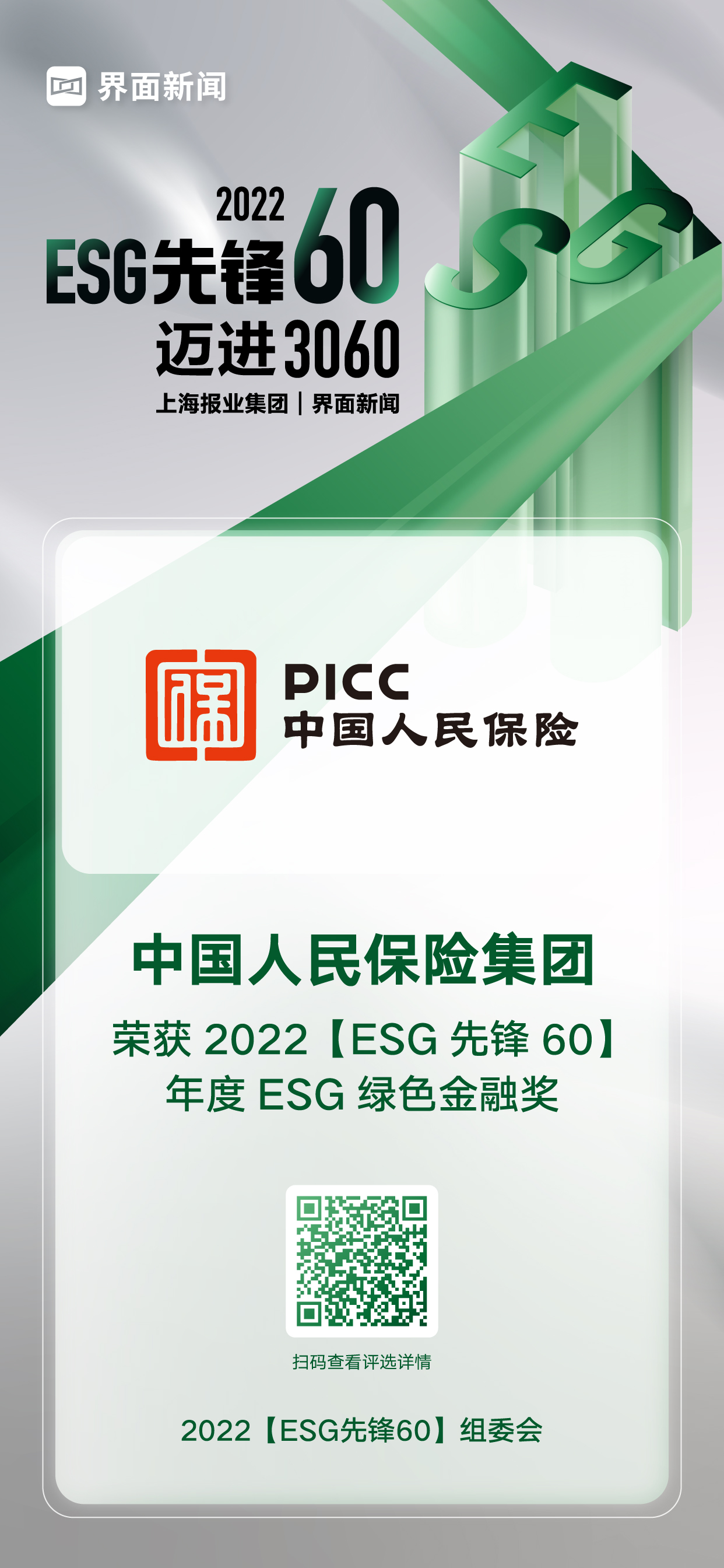 12月20日,上海报业集团|界面新闻在上海中心举办了2022【ESG先锋60】颁奖典礼,并正式公布了本年度获奖名单。在这项万众期待的关于ESG议题的年度评选中,来自各行各业的绿色先锋企业与先锋探索人物,凭借年度市场表现与行业影响力,获得年度大奖。其中,中国人民保险集团凭借其在行业内的优异表现,荣膺年度ESG绿色金融奖。