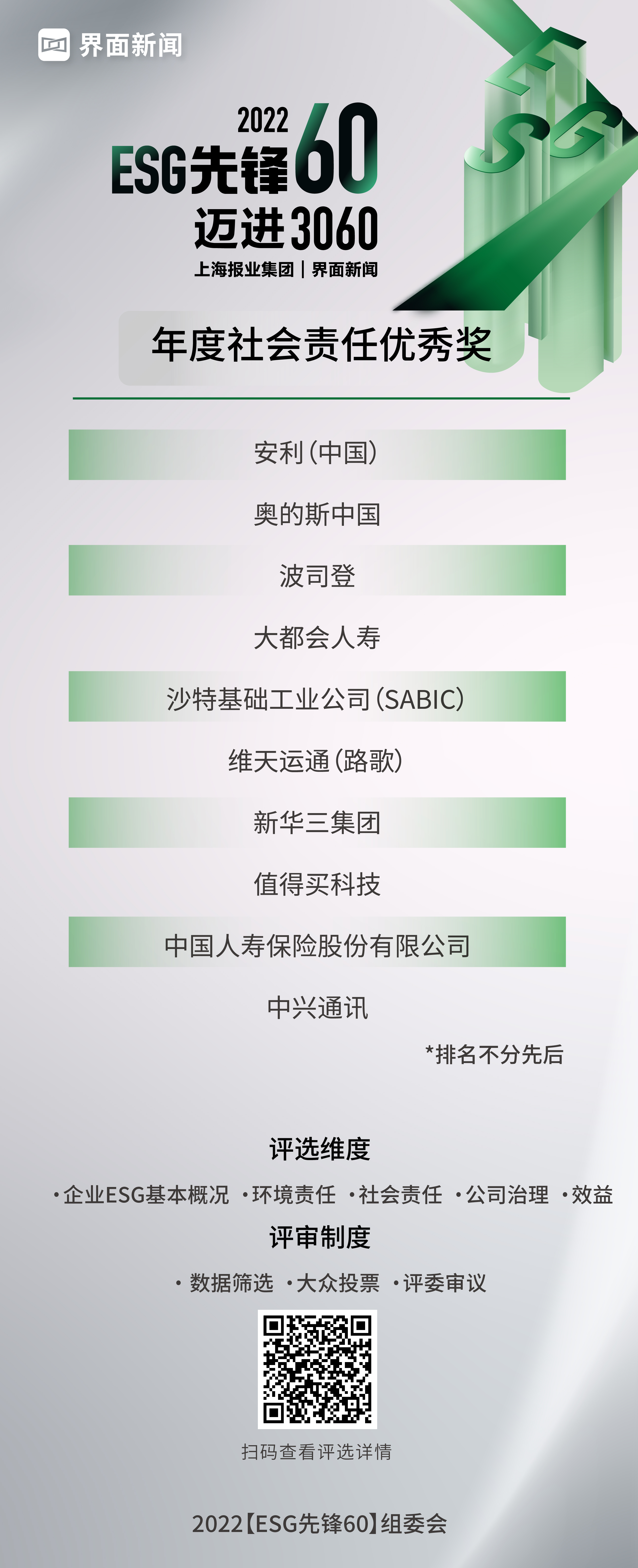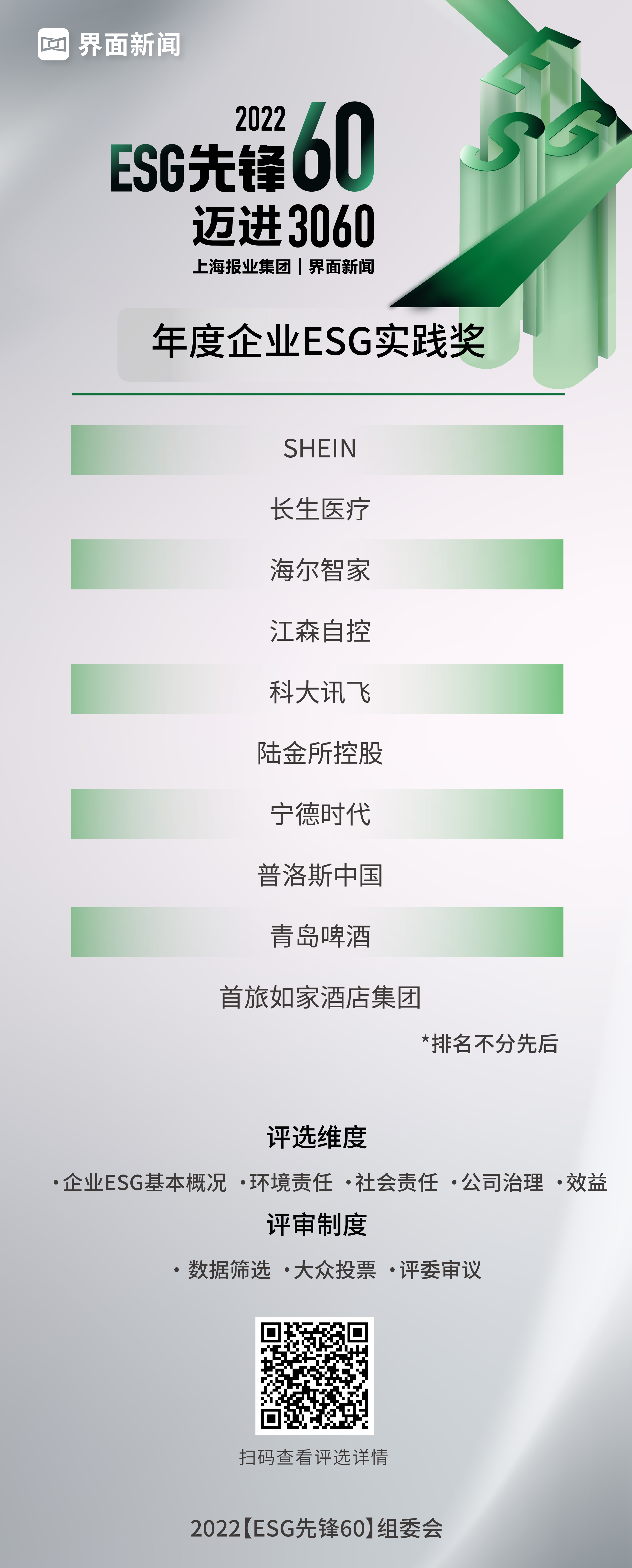 2022【ESG先锋60】评选在综合考量企业ESG的基本概况、环境责任、社会责任、公司治理责任以及效益五大维度的基础上,通过两个多月的数据筛选、大众投票、评委审议等多个环节的考察,全面衡量了参选企业的ESG实践能力,力求对企业的年度价值和ESG表现作出客观、公正的评价。在经历层层筛选之后,55家ESG绿色企业与12位业内先锋人物位列终榜,共同夺得这项殊荣!