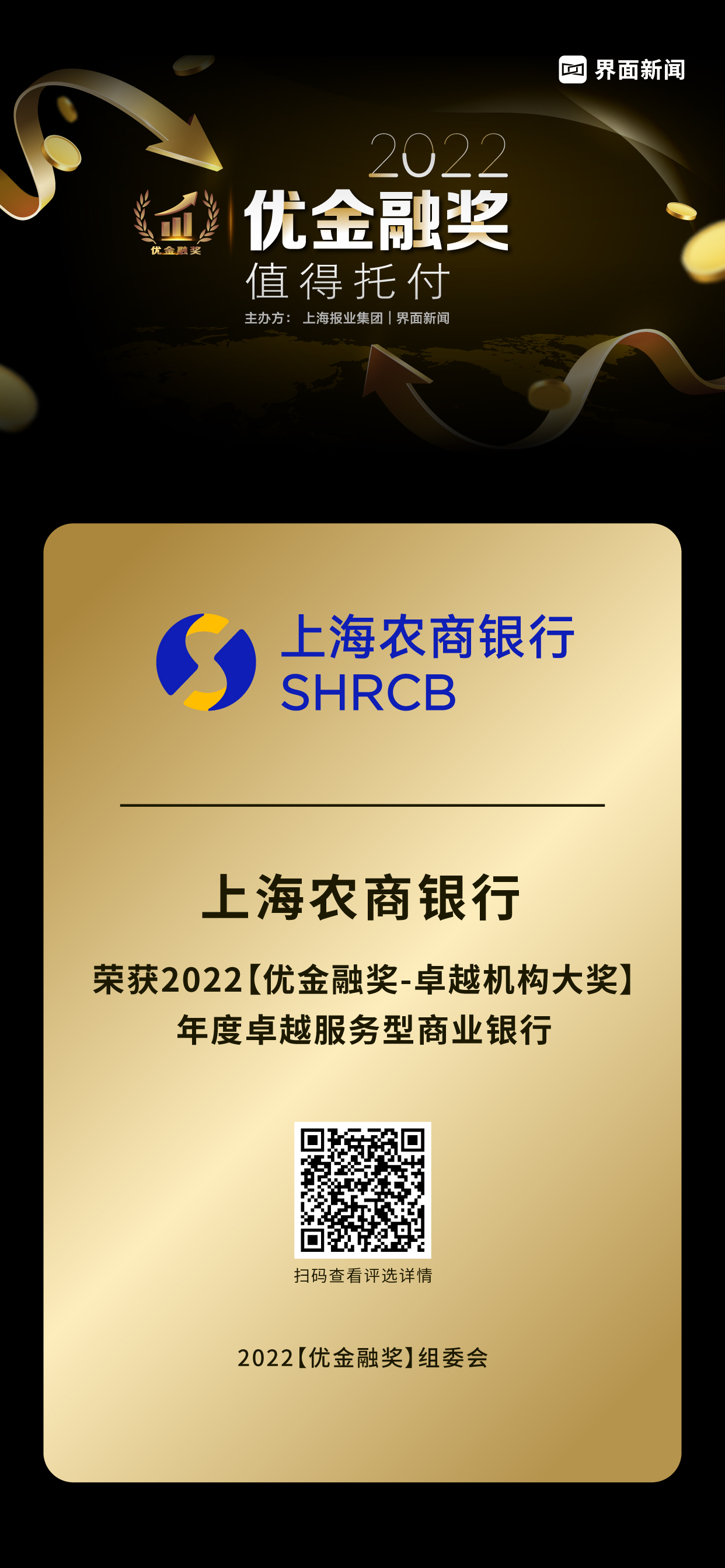 12月20日,上海报业集团|界面新闻在上海中心举办了2022【优金融奖】颁奖典礼,并正式公布了本年度获奖名单。在这项万众期待的金融业年度评选中,来自银行、保险、证券基金、信托、资管、金融科技、财富管理、移动支付等领域的金融机构与企业,凭借年度市场表现与行业影响力,获得年度大奖。其中,上海农商银行凭借其在行业内的优异表现,荣膺卓越机构大奖——年度卓越服务型商业银行。