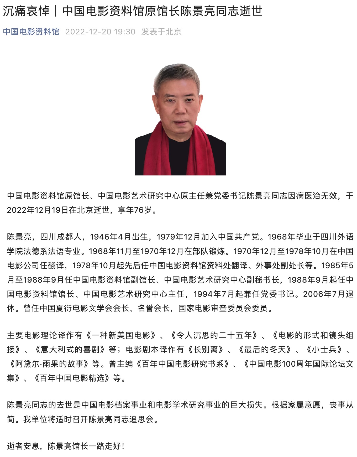据中国电影资料馆微信公众号消息,中国电影资料馆原馆长、中国电影艺术研究中心原主任兼党委书记陈景亮因病医治无效,于2022年12月19日在北京逝世,享年76岁。