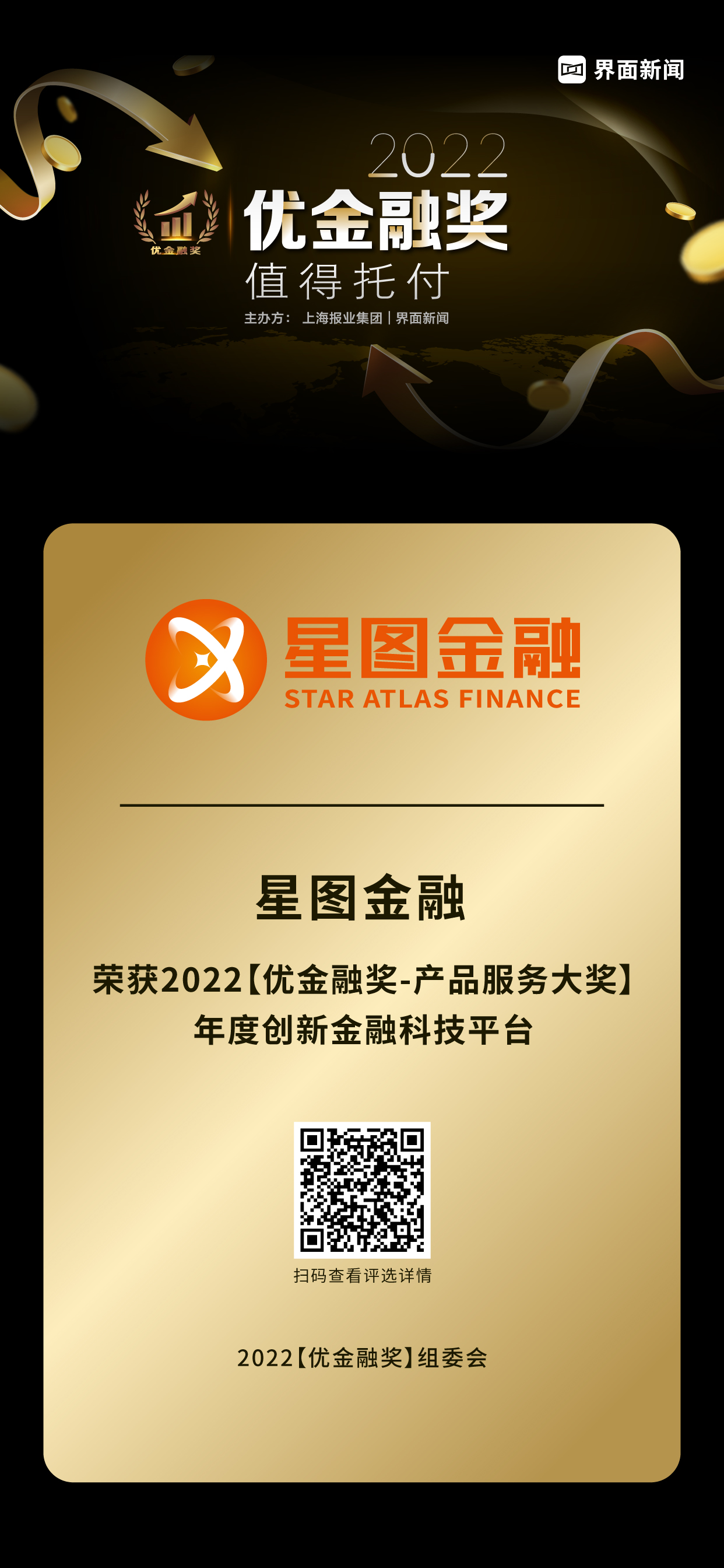 12月20日,上海报业集团|界面新闻在上海中心举办了2022【优金融奖】颁奖典礼,并正式公布了本年度获奖名单。在这项万众期待的金融业年度评选中,来自银行、保险、证券基金、信托、资管、金融科技、财富管理、移动支付等领域的金融机构与企业,凭借年度市场表现与行业影响力,获得年度大奖。其中,星图金融凭借其在行业内的优异表现,荣膺产品服务大奖——年度创新金融科技平台。