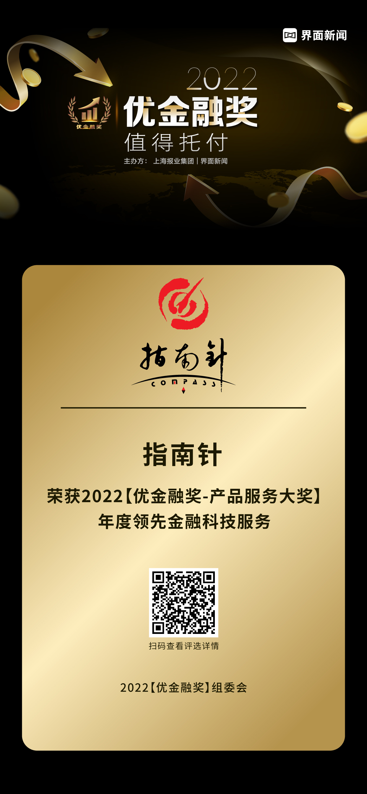 12月20日,上海报业集团|界面新闻在上海中心举办了2022【优金融奖】颁奖典礼,并正式公布了本年度获奖名单。在这项万众期待的金融业年度评选中,来自银行、保险、证券基金、信托、资管、金融科技、财富管理、移动支付等领域的金融机构与企业,凭借年度市场表现与行业影响力,获得年度大奖。其中,指南针凭借其在行业内的优异表现,荣膺产品服务大奖——年度领先金融科技服务。