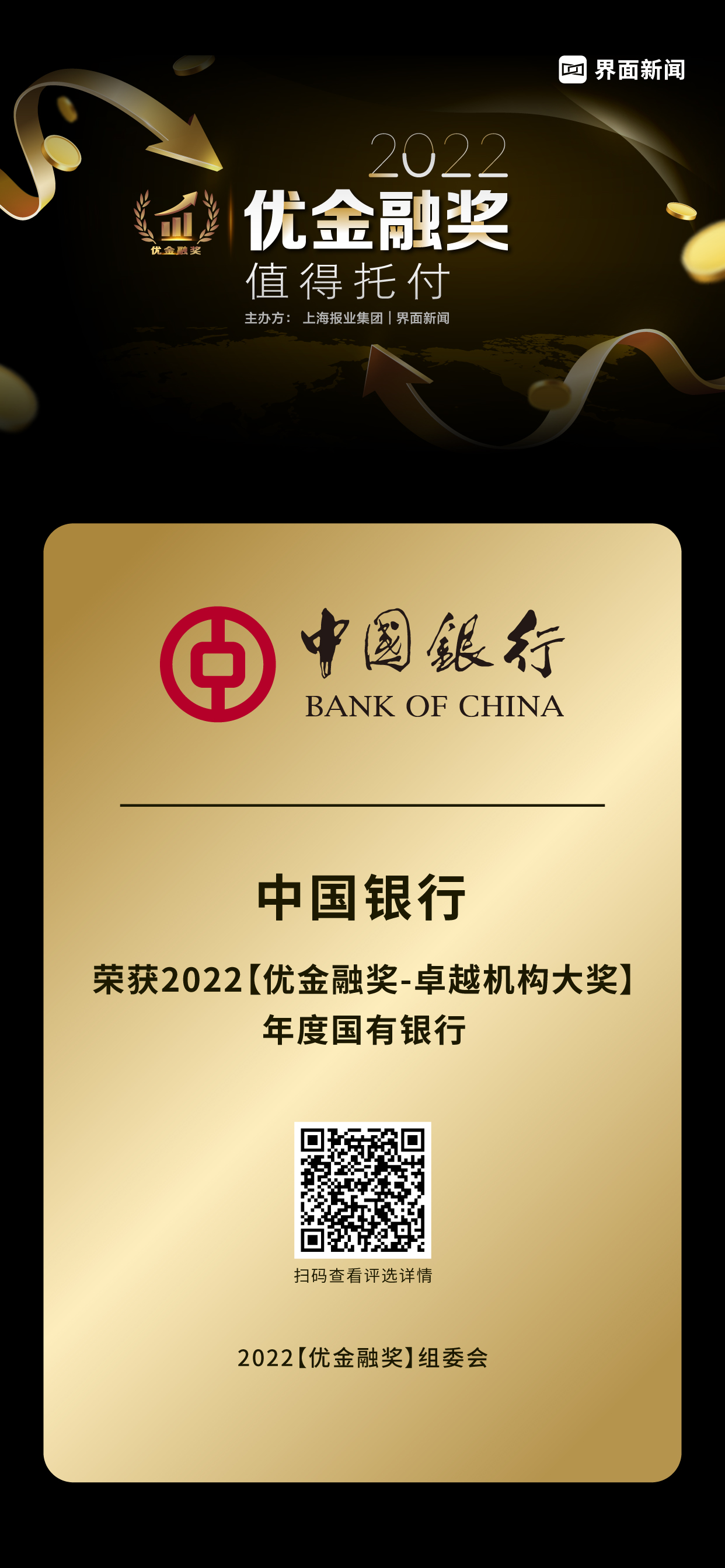 12月20日,上海报业集团|界面新闻在上海中心举办了2022【优金融奖】颁奖典礼,并正式公布了本年度获奖名单。在这项万众期待的金融业年度评选中,来自银行、保险、证券基金、信托、资管、金融科技、财富管理、移动支付等领域的金融机构与企业,凭借年度市场表现与行业影响力,获得年度大奖。其中,中国银行凭借其在行业内的优异表现,荣膺卓越机构大奖——年度国有银行。