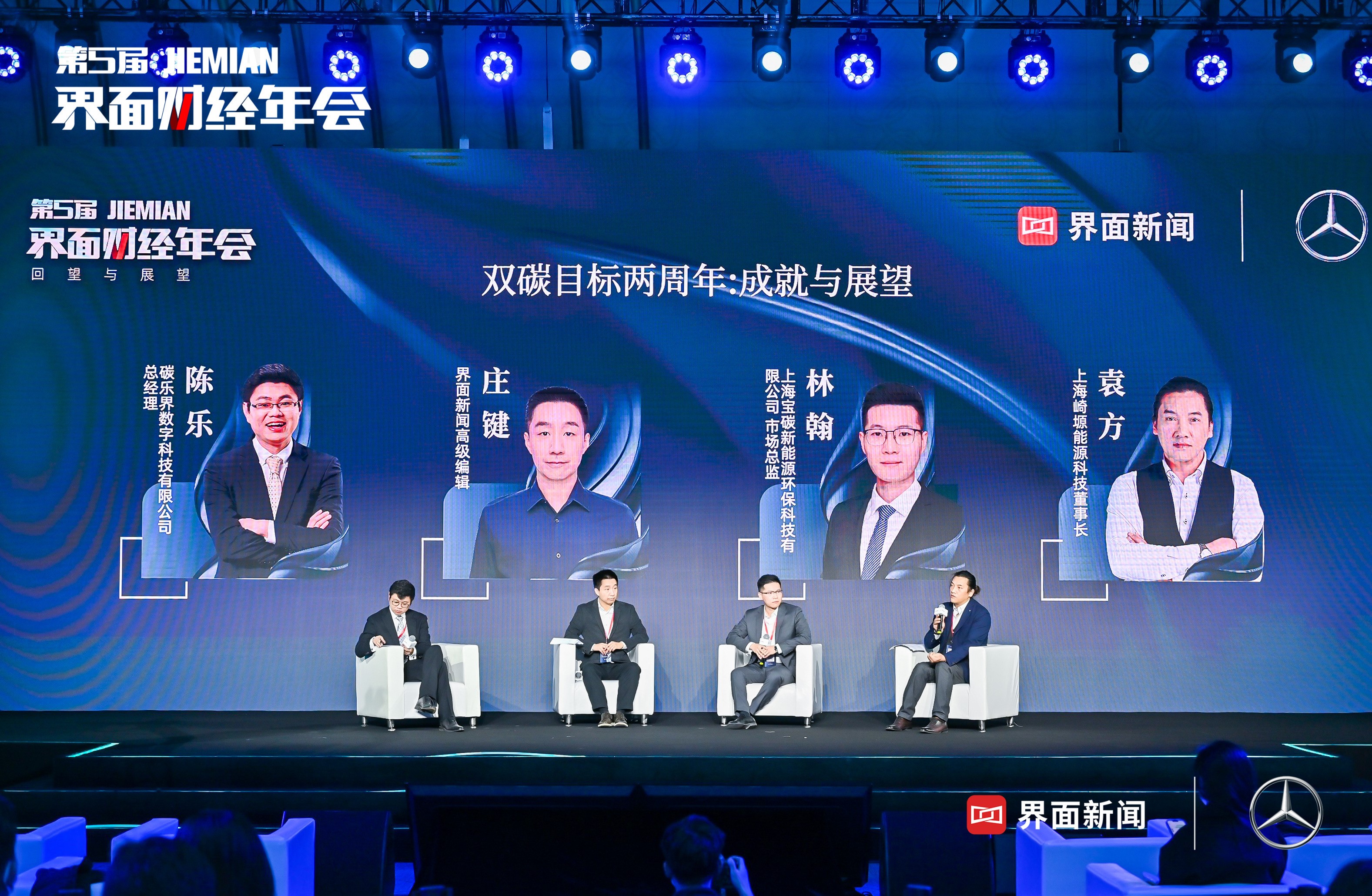 圆桌论坛围绕《双碳目标两周年:成就与展望》这一话题进行探讨。由碳乐界数字科技有限公司总经理 陈乐作为主持,界面新闻高级编辑庄键、上海宝碳新能源环保科技有限公司市场总监林翰、上海崎塬能源科技董事长袁方参与这一环节的讨论。