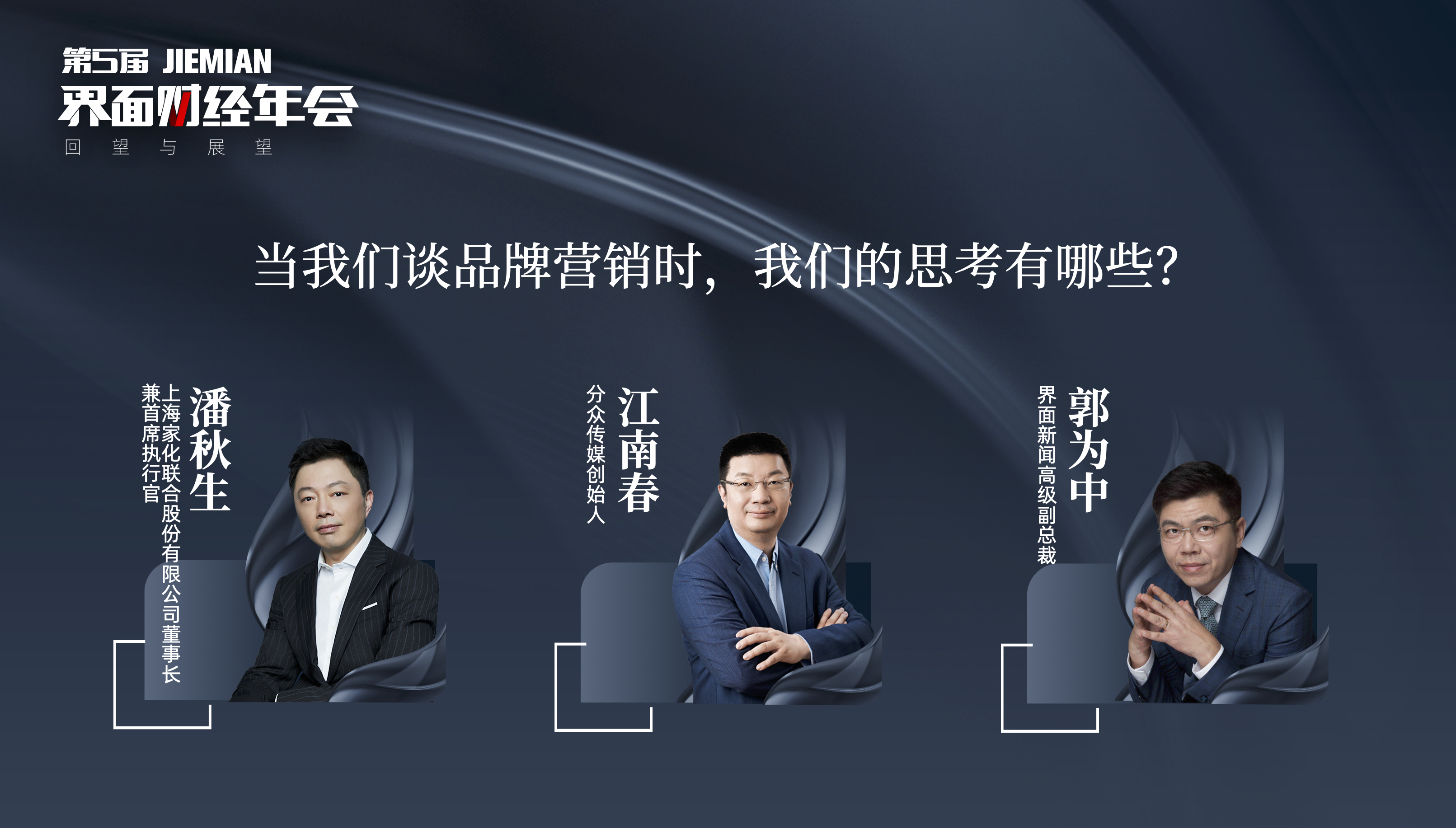 品牌对话围绕《当我们谈品牌营销时,我们的思考有哪些?》这一话题进行探讨。界面新闻高级副总裁郭为中担任对话主持,上海家化联合股份有限公司董事长兼首席执行官潘秋生,分众传媒创始人江南春参与了讨论。