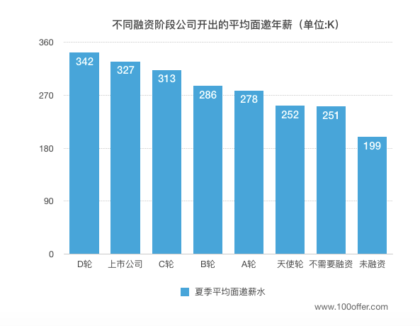 在公司的融资阶段上,依然是C轮以上的中大型公司开出的薪水最丰厚。B轮以下企业受资本寒冬影响,开出的面邀年薪相对C轮企业平均低出5-7万。