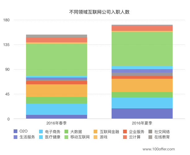 相反,不同领域互联网公司的入职人数相比春季反而略微增长。表现最明显的是O2O企业,入职人数增长了一半以上。