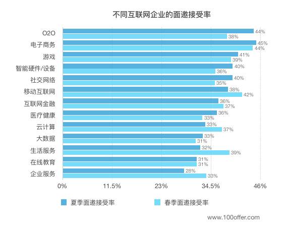 和今年春季相比,一些比较热门的互联网领域的面邀接受率开始降低,比如移动互联网、互联网金融、生活服务、云计算等。其中,受今年年后e租宝等非法企业负面新闻的影响,候选人在收到互联网金融类企业的面邀时,表现得更加谨慎。