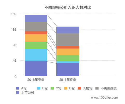 接着上面「候选人期望加入的公司规模」这个话题,我们发现在不同规模公司的入职人数上,夏季加入上市公司的候选人数快超过春季人数的一半,而A-D轮企业的入职人数均有所减少。