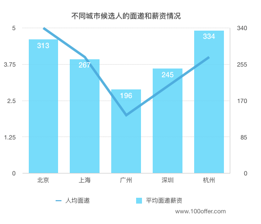 和春季相比,大部分城市的面邀薪资有小幅下降,唯一值得注意的是杭州市候选人的面邀数和薪资情况。