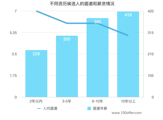 今年夏季,不同资历候选人的受欢迎程度反映出两种极端,2年以下工作经验的初级候选人收到的人均面邀数最多,而10年以上经验的资深候选人却只有人均5封面邀,但两者的面邀薪资却相差近20万,足见寒冬过后的企业对资深候选人的要求更加苛刻。