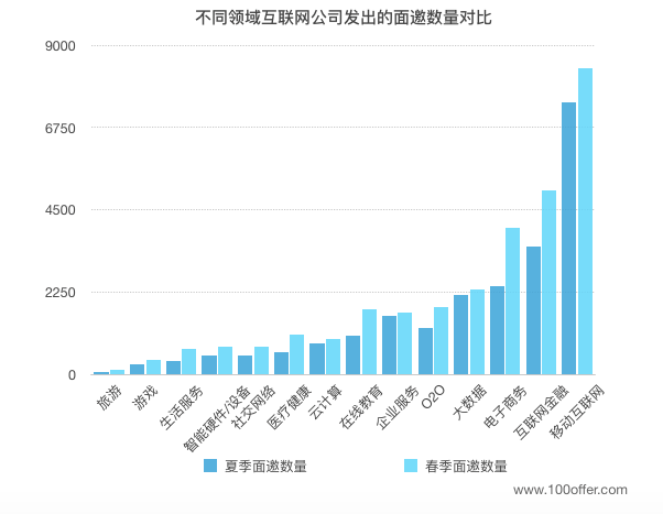 和跳槽季春季相比,各领域互联网公司夏季的招聘数量明显大幅减少。特别是O2O行业,在去年资本寒冬中阵亡了一大批创业公司后,发出的面邀数减幅明显。