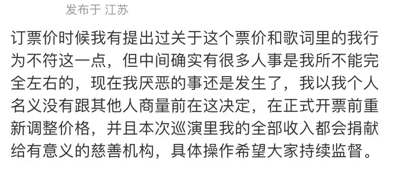 而因票价不满的现象近期也频有发生,孟美岐演唱会在livehouse场地,在没有固定位置的场地设立了2500个座位,并划分贵宾区和普通区,被质疑“割韭菜”。法老的巡演门票订价568元引发了部分网友不满。最终的解决方案是,法老本人下场回应票价争议,表示订票价时有提出质疑,但“有许多自己无法左右的人事,厌恶的事还是发生了”,并宣布将以个人名义在正式开票前改价,并将本次巡演全部收入捐至慈善机构。
