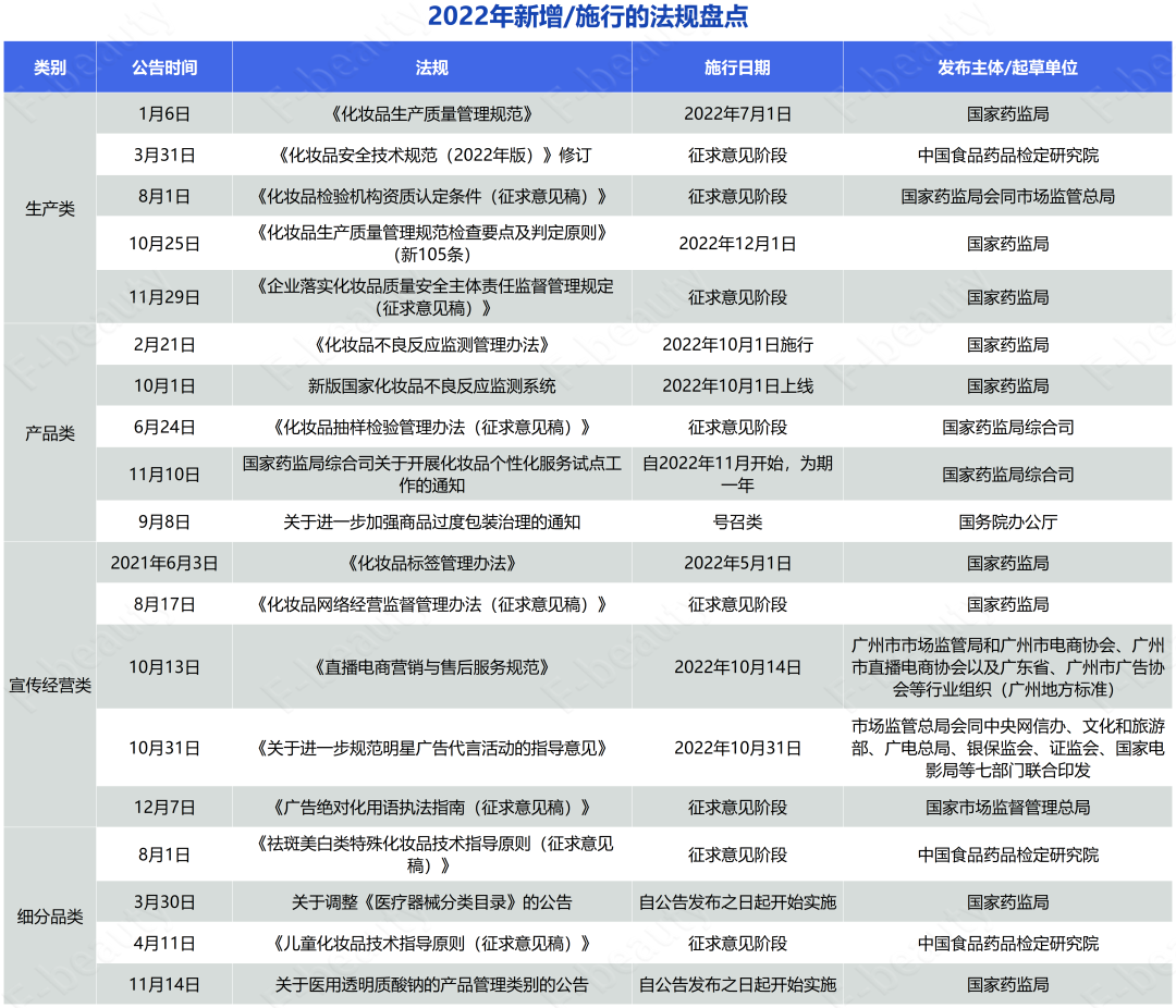 如果说2021年是中国化妆品新监管时代的开端,那么2022年就是整个监管体系全面立起“四梁八柱”,并通过自上而下加自下而上,企业和主管部门之间不断互相磨合和促进,并且相互补充,将整个监管体系全面“建起来”的一年。