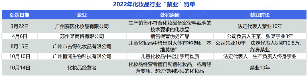 从市场监管部门对违法违规行为的严厉处罚中可窥见一二。据统计,今年以来相关部门已经开出5张化妆品相关企业的“禁业罚单”,其中,“终身禁业”的罚单就有2起。