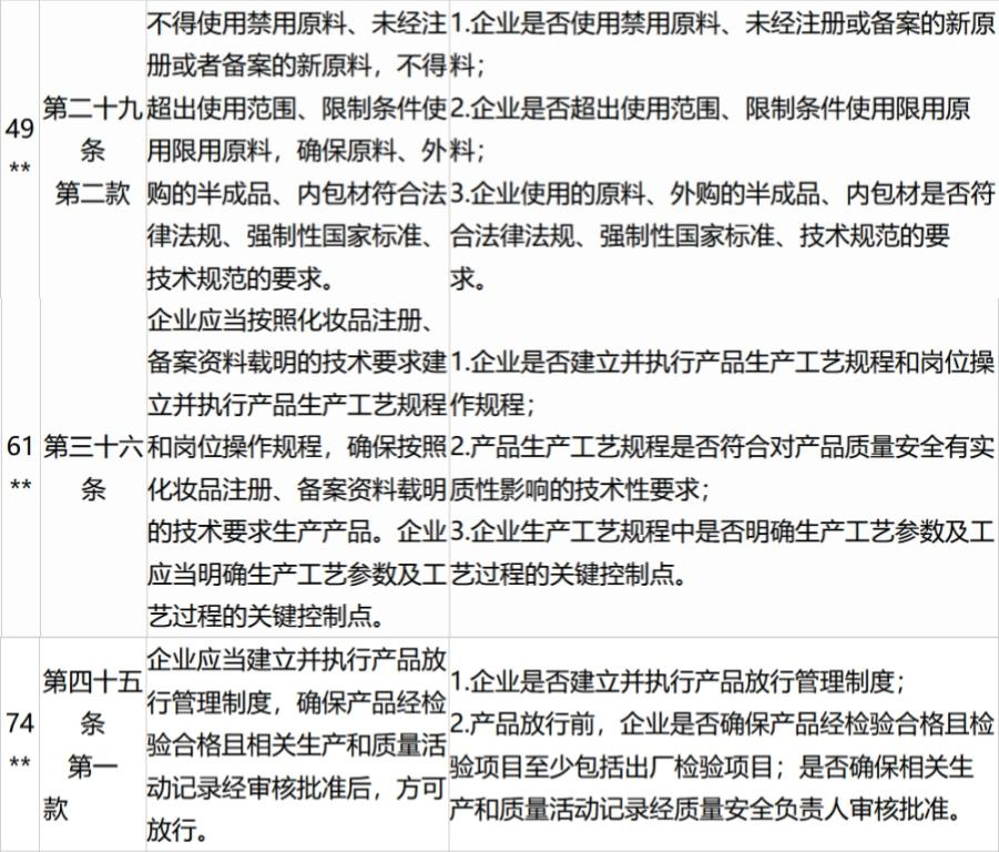 此外,不同于旧版“105条”,《化妆品生产质量管理规范检查要点及判定原则》(新“105条”)的检查要点更加严格,其中明确指出,在原料使用、生产环节以及产品放行管理制度这三项关键项目不合格的企业,可以直接被责令停产整顿。