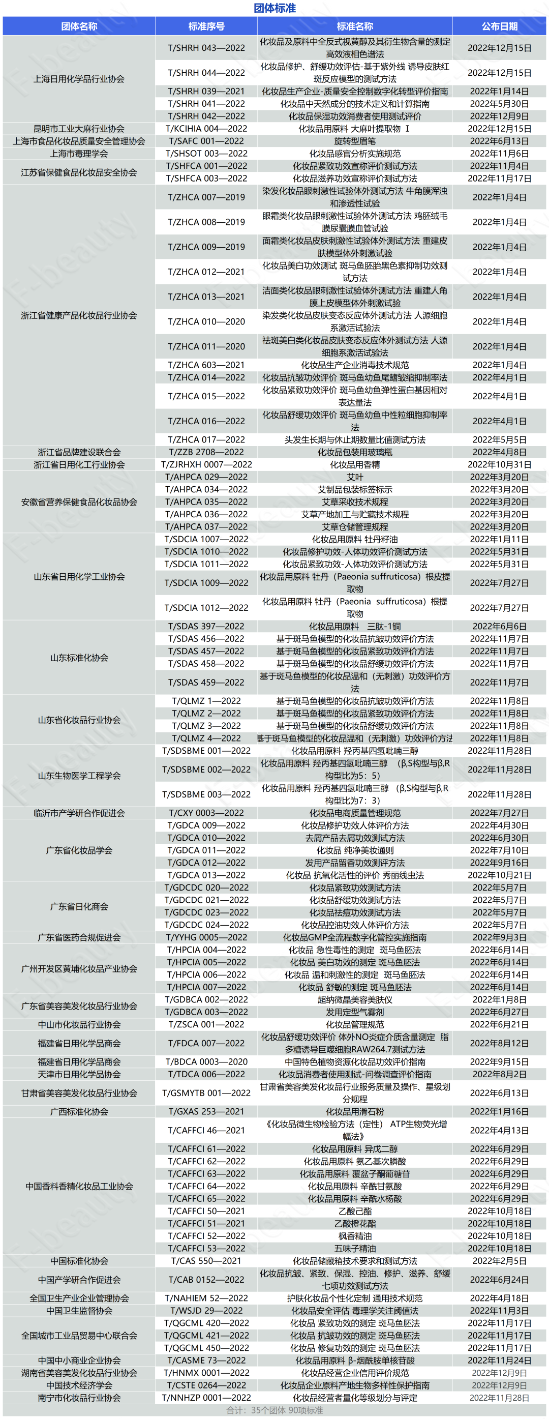据不完全统计,2022年以来共有35个和化妆品相关的团体组织制定了共90项团体标准,各省的化妆品行业协会、日化商会、标准化协会等是其中的主力。这也创下了近5年,化妆品产业出台团标数量的历史新高。