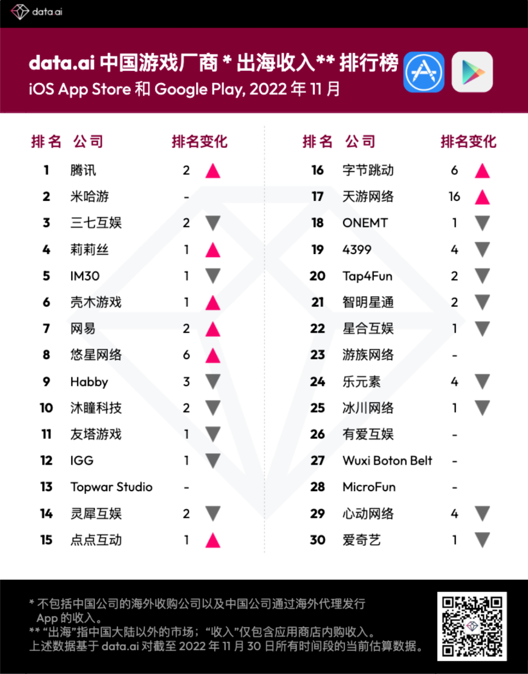 11月中国游戏厂商出海收入排行榜前五名为腾讯、米哈游、三七互娱、莉莉丝、IM30。相比十月,腾讯排名上升2位,成为收入榜单第一。