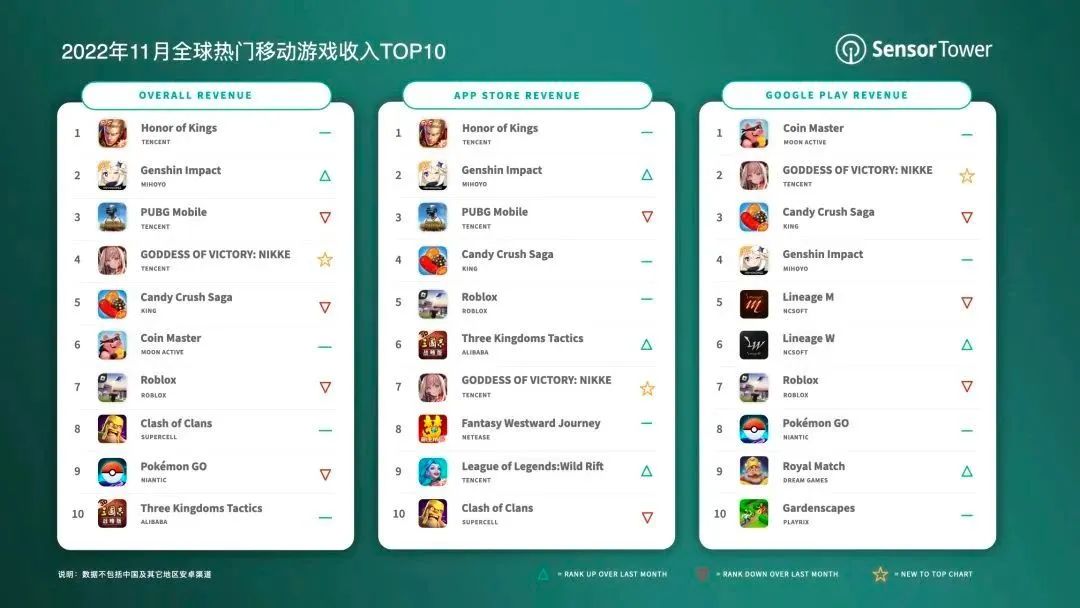 11月该游戏在日本、韩国和美国分列手游畅销榜第1、3和18名,总收入超过1亿美元,空降成为11月Sensor Tower全球移动游戏收入排行榜第四名,仅次于《王者荣耀》、《原神》与《PUBG Mobile》。