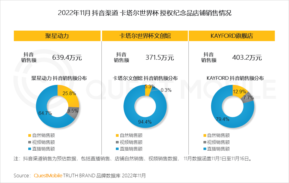 电商方面,抖音在世界杯专题中推出了「世界杯好物」,用户可以直接在抖音内购买赞助商们的产品及衍生品。根据QuestMobile数据显示,在11月世界杯期间,聚星动力、卡塔尔世界杯文创馆、KAYFORD旗舰店销售额突破千万,阿根廷国家队2022年世界杯官方助威服在抖音销量突破万件。同时,卡塔尔世界杯官方旗舰店等授权店铺几乎每天都举行直播带货,售卖官方纪念品。