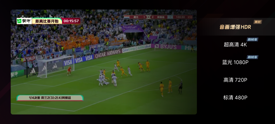 本届世界杯直播中,抖音免费开放了4K高帧率模式,且完全无片头广告。同时,除自有解说链路之外,抖音开放了央视解说、现场原声都多个解说通道选择。