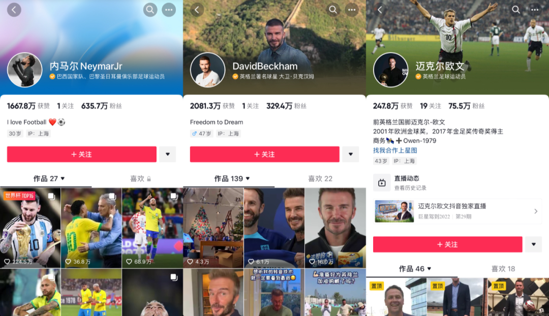本届世界杯期间,抖音同样邀请了内马尔、贝克汉姆、迈克尔欧文等国际足联大咖进行入驻。但这些著名球星更新的内容显得“仓促感”和“功利性”较强——内马尔和贝克汉姆更新的内容几乎完全搬运外网平台,欧文更新的内容也与世界杯缺乏关联。