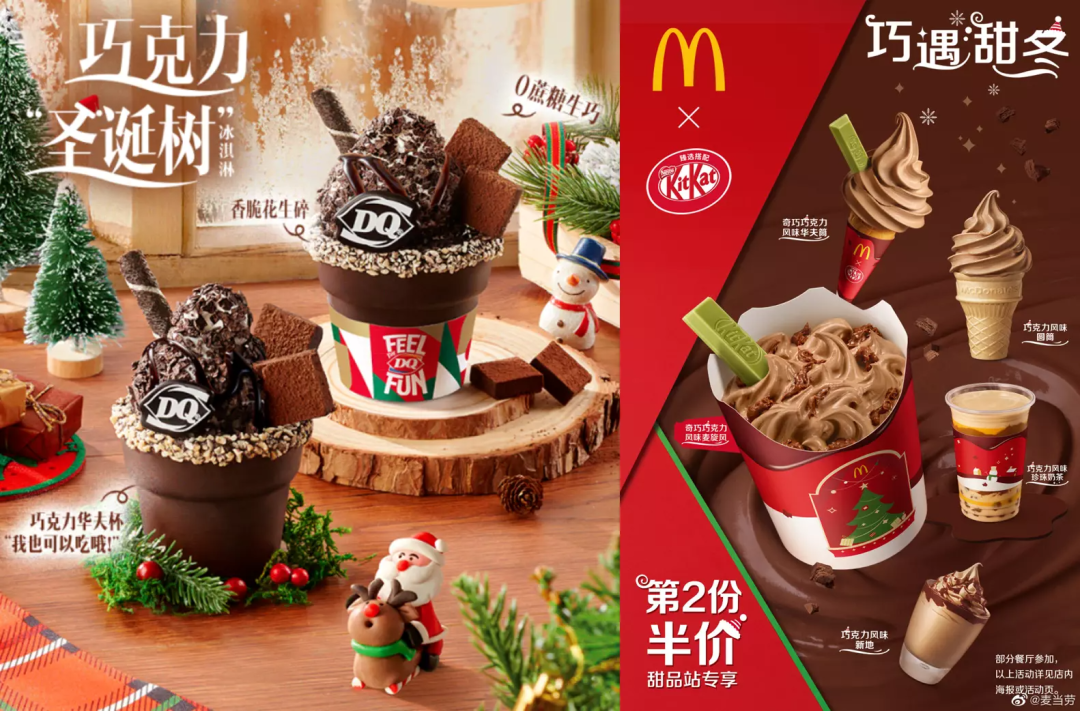 大品牌们的动作往往是比较早的,11月底,DQ就开始预告今年的圣诞新品“巧克力圣诞树冰淇淋”将于12月1日正式上市,所使用的元素仍然是冬季较受欢迎的巧克力、榛子等,并搭配巧克力华夫杯制成圣诞树的造型,讨巧可爱。麦当劳则是与KitKat联名上新奇巧巧克力麦旋风、华夫筒,用绿色的KitKat威化映衬出圣诞氛围。