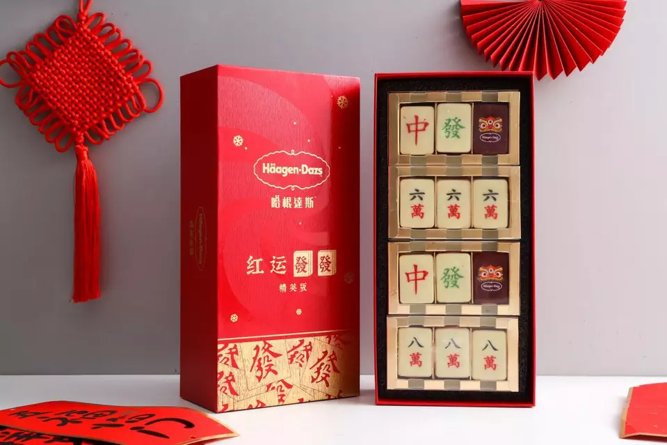 春节和情人节也同样值得关注,2022年的虎年,哈根达斯将中国人过年的传统娱乐活动“打牌”融入其中,推出了“红运发发”精英版礼盒,外形精致小巧的12枚“麻将”由5种不同口味的冰淇淋组合而成,分别印有“六萬”、“八萬”、“中”、“發”和“虎头”,寓意开局必赢,演绎国潮文化的同时赚足了眼球。口味上以花朵、水果为主,让唇齿间充斥着春天的气息。