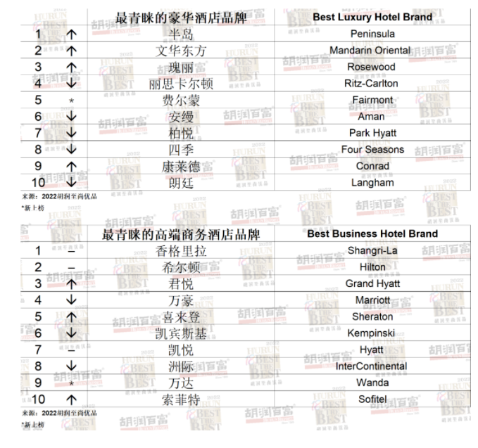 胡润研究院在今年1月份发布的《2022胡润至尚优品—中国高净值人群品牌倾向报告》,针对中国高净值人群在酒店选择上进行排名。其中,豪华酒店方面,半岛和文华东方位居前两位;高端商务酒店方面,香格里拉和希尔顿位居前两位。