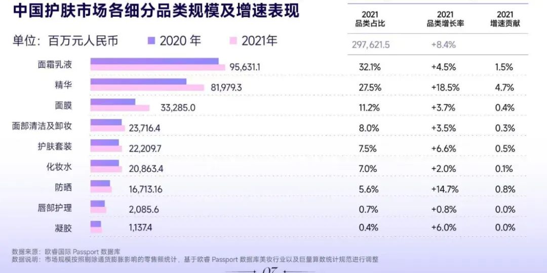 据巨量算数联合欧睿Euromonitor发布的《2022巨量引擎美妆白皮书》,2021年,中国护肤各细分品类中,市场规模前三大品类依次为面霜乳液、精华和面膜,其中,面霜乳液市场规模达956.3亿元,为护肤品类之最。