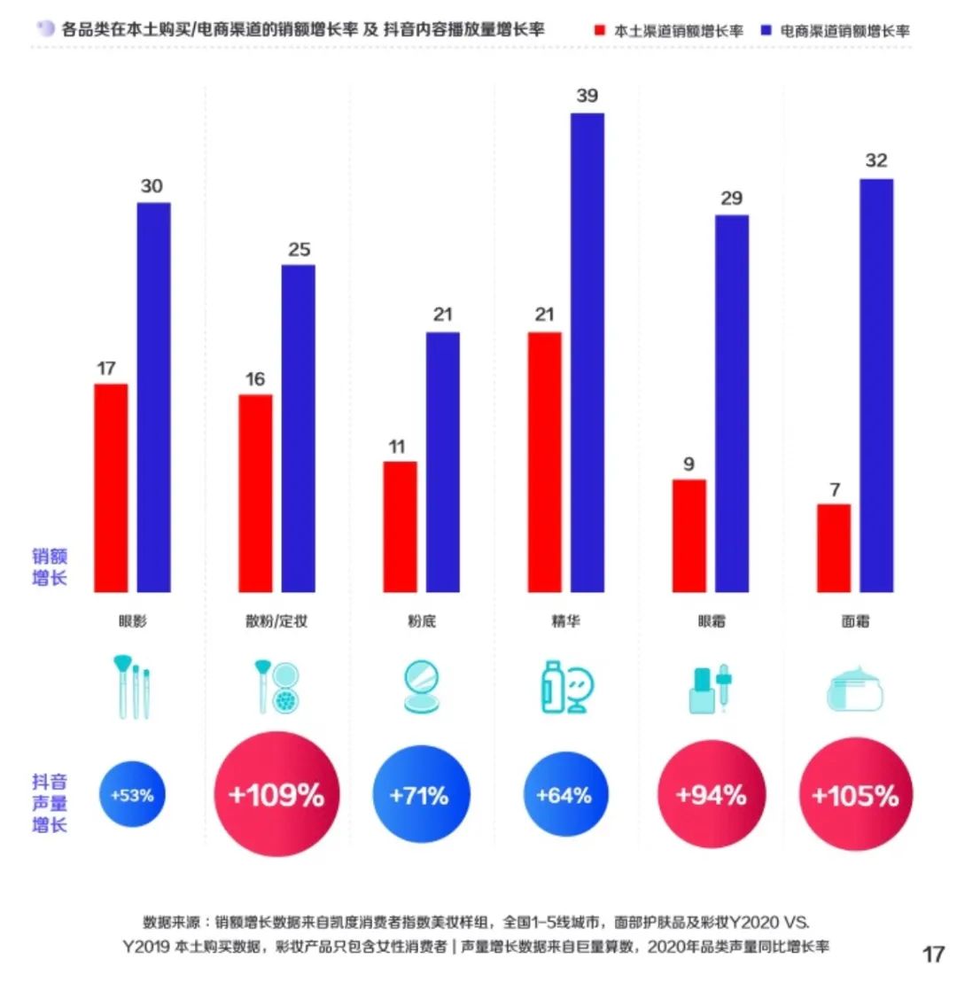 但从市场端数据来看,自2020年,品牌专卷精华这一现象已有所改变。据《2021巨量引擎美妆行业白皮书》,就抖音内容播放量增长率而言,2020年,面霜的抖音声量同比增长105%,高于精华的64%。此外,从销售额增长率来看,这一年,面霜在电商渠道的增长率超过了眼霜等品类,为护肤品类中的增长亚军。