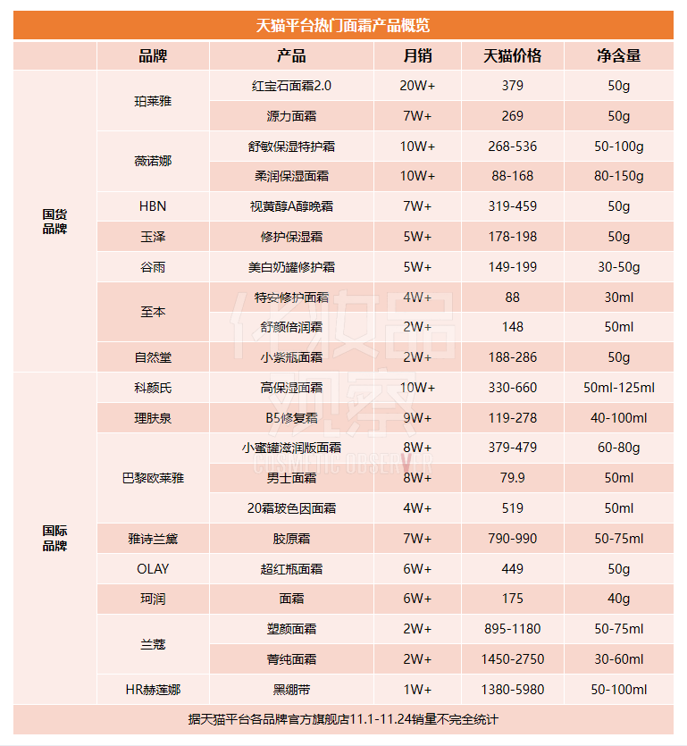 不过,化妆品观察统计天猫平台热销的相关面霜产品数据后,发现面霜品类的各类玩家已形成新的发展格局。