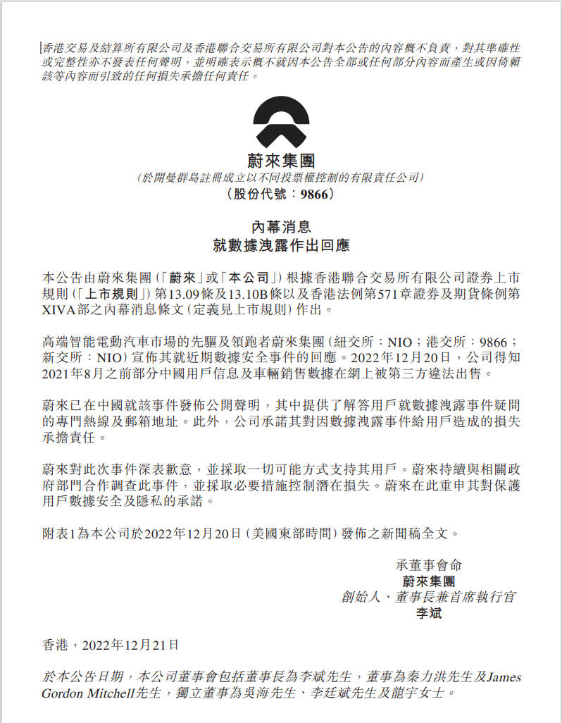 蔚来汽车于12月21日晨间于港交所发布公告,对此前黑客窃取公司内部数据作出进一步回应。