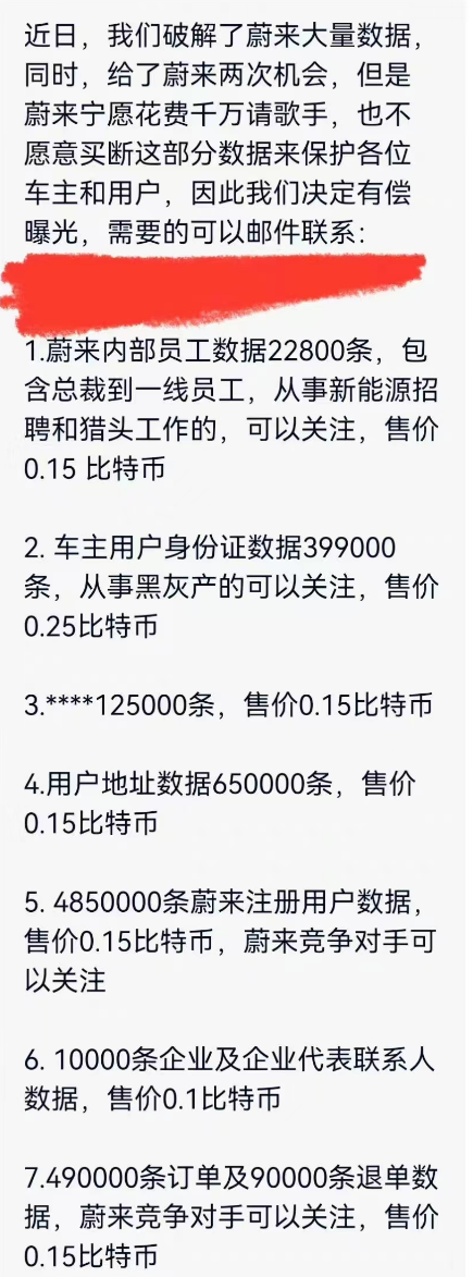 20日晚,一张疑似黑客售卖从蔚来处窃取数据的截图在社交平台传播。黑客声称“给了蔚来两次机会,但蔚来不愿买断这部分数据保护车主和用户,因此决定有偿曝光。”