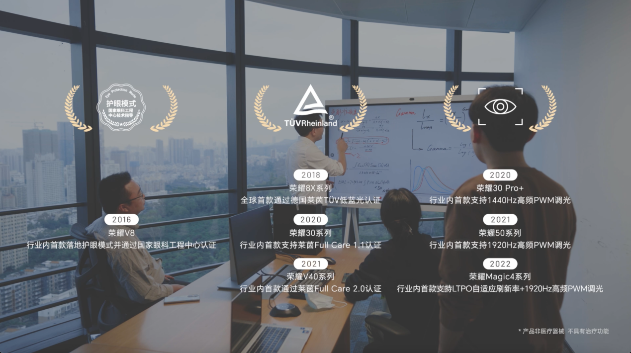 2018年,荣耀8X成为全球首款通过Tuv莱茵低蓝光认证的手机;2020年,荣耀30系列成为业内首款支持莱茵Full care1.1认证的手机、荣耀30Pro更是率先支持1440Hz高频PWM调光;2021年,荣耀40系列通过莱茵Full care2.0认证,50系列支持1920Hz高频PWM调光;2022年荣耀Magic4系列搭载了行业首创的LTPO屏幕……