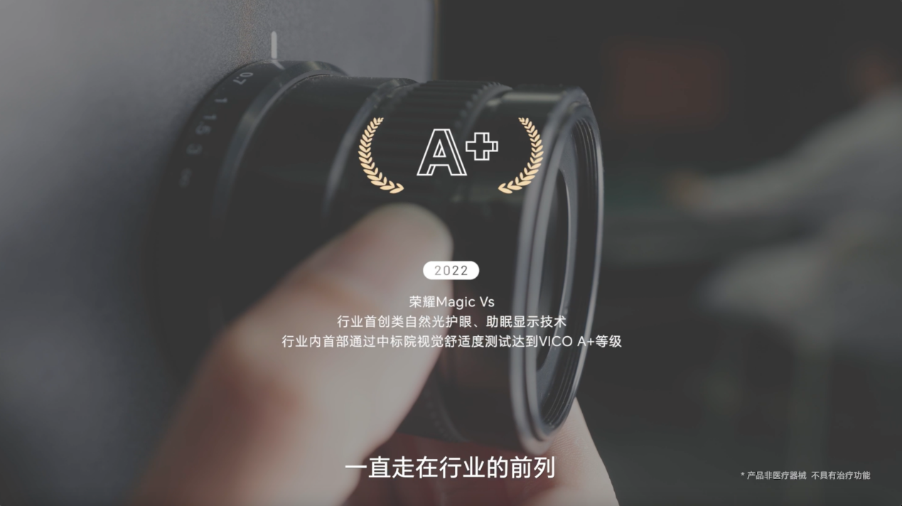 荣耀多年来在屏幕健康显示领域的研究成果,在最新一代的荣耀Magic Vs系列上得到完美的体现。折叠屏幕贴合了商务人士的功能性需要,在护眼健康的深耕更是贴合高端人群的使用痛点。 助眠显示和全新的类自然光护眼技术的突破创新,一举让荣耀Magic Vs成为业内首个通过中标院VICO A+舒适性认证的产品。