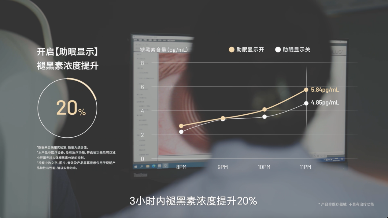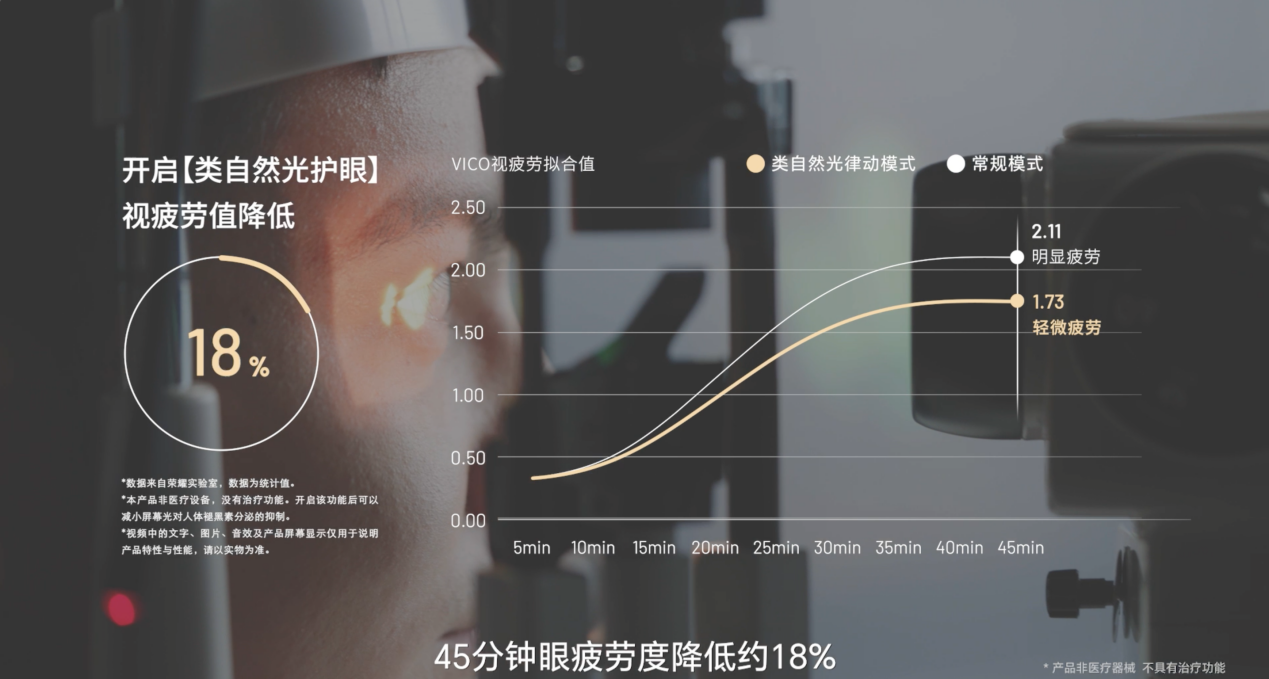 荣耀通过800余名用户睡眠实验收集综合体征反馈数据,10000余名用户进行人因实验收集视觉疲劳反馈数据,经过上万次测试,找到了让人更舒适的亮度曲线,在屏幕上模拟自然光的律动,让眼睛的睫状肌保持自然的律动,帮助用户减缓视觉疲劳。
