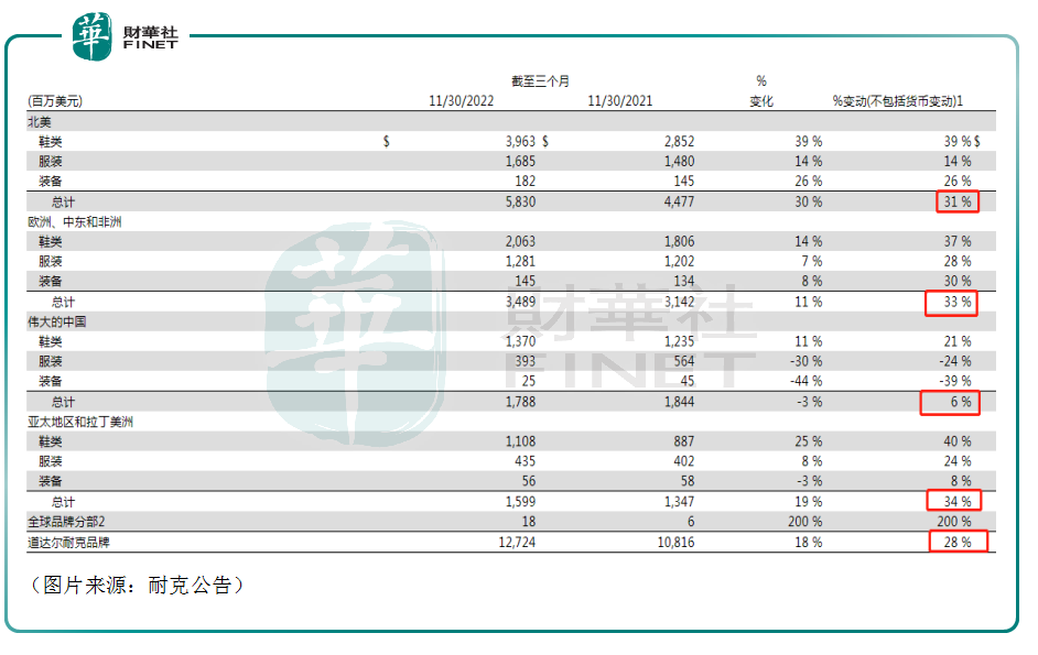 期内,耐克品牌的收入为127亿美元,在报告的基础上增长了18%,在货币中性(即汇率不变)的基础上增长了28%,所有地区和渠道的收入都出现了强劲增长。