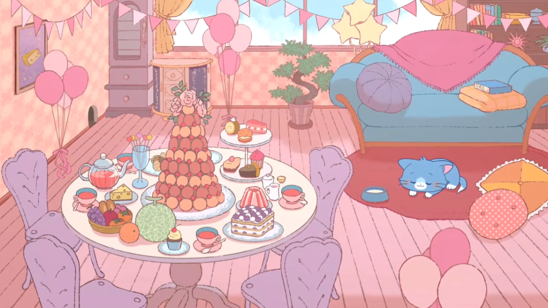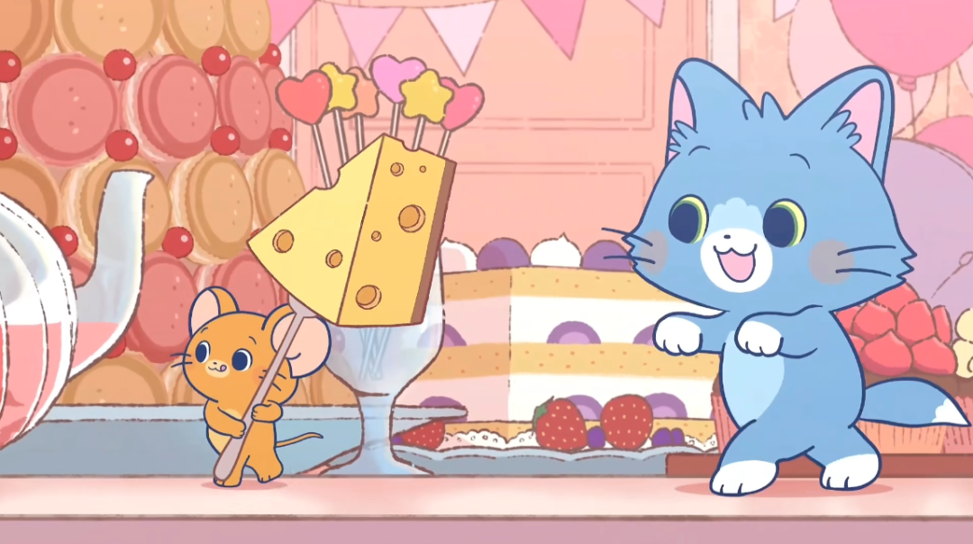 前段时间,日本卡通网放出了日版《猫和老鼠》短动画,每集时长仅一分钟左右,汤姆和杰瑞的身材比例浓缩成Q版,外形变得更加圆润;两人的打闹也不再斗智斗勇,反而增添了过家家式的其乐融融;色彩方面饱和度降低,背景则通过各式甜品、粉色墙纸等展示出浓厚的派对氛围,大幅减少了猫鼠追逃大战的紧张感;配音、配乐同样为作品的“萌”浓度增加数倍。