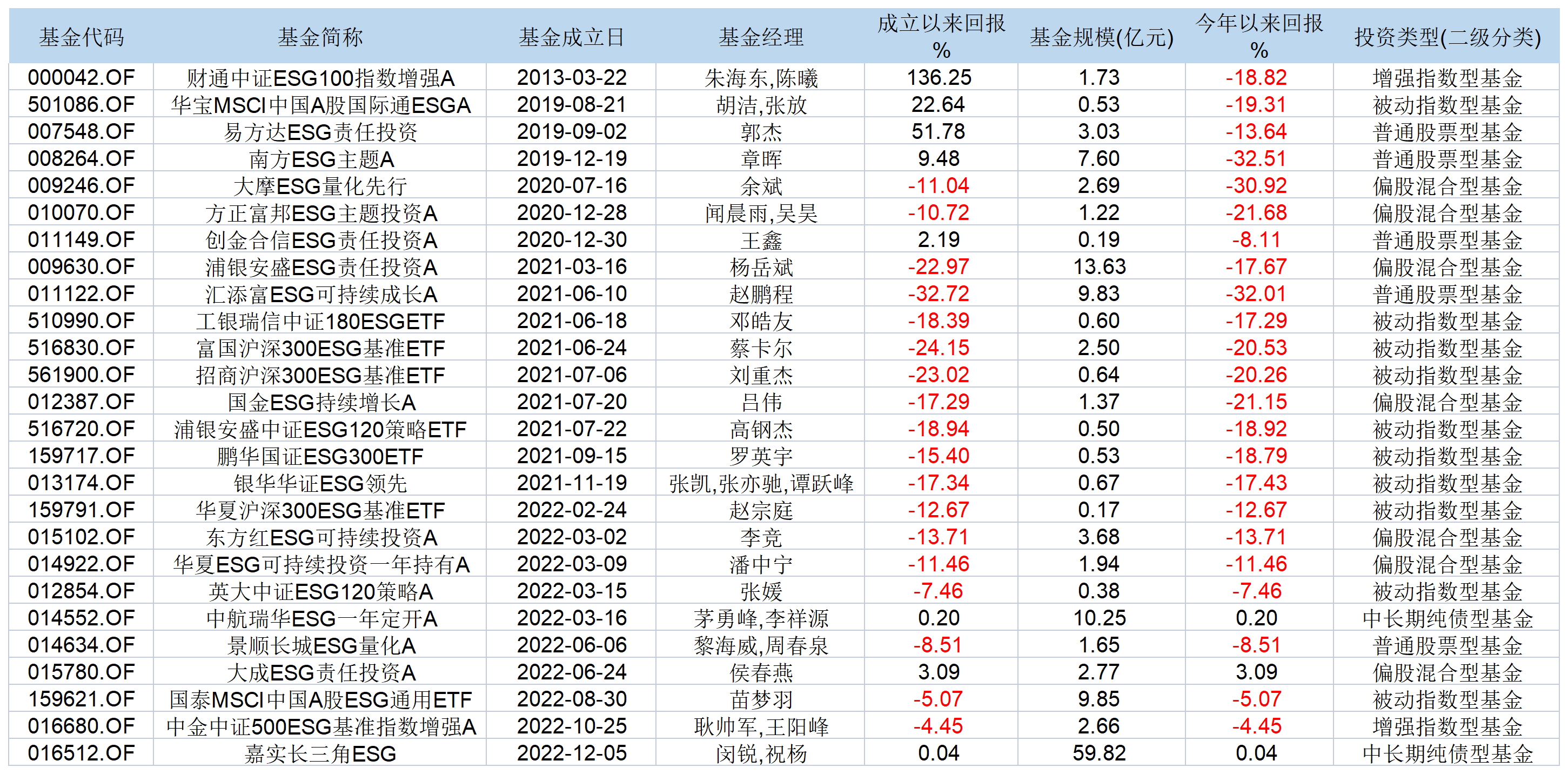 截至12月21日,界面新闻记者统计发现,目前共有26只名称中含有ESG字样的基金。从成立时间来看,财通中证ESG100指数增强基金是首只跟踪相关指数的增强型基金,成立于2013年3月22日,至今回报率为136.25%。截至三季度末,该基金规模为1.73亿元。2019年成立的华宝MSCI中国A股国际通ESG、易方达ESG责任投资、南方ESG主题等三只基金的回报率分别为22.64%、51.78%、9.48%。
