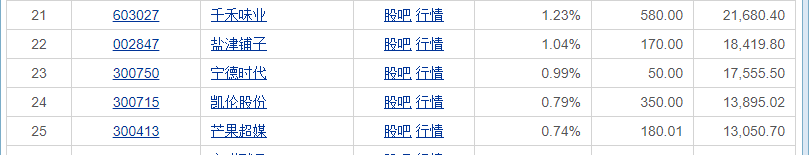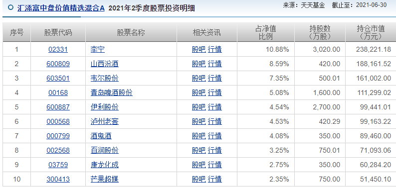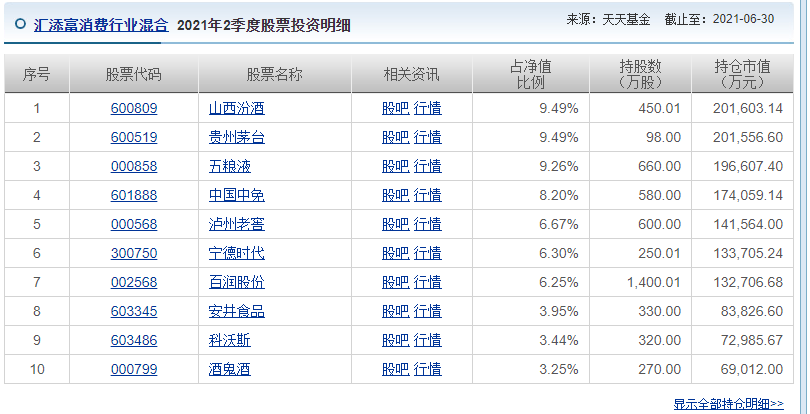 作为前两年沪深两市最热门的股票之一,宁德时代最火时曾被2600多家基金持有。这只新能源车行业龙头,2021年2季度进入汇添富消费行业混合基金持仓前十,位居第六,持股250.01万股,净值占比6.3%。