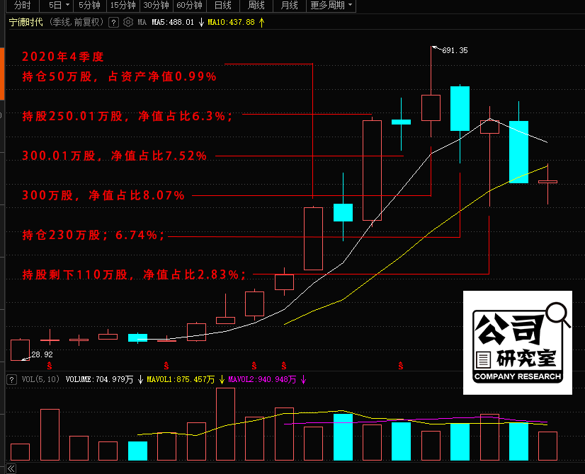 公司研究室查阅了这只基金2021年1季度的持仓组合,没有发现宁德时代,最早是在2020年4季度持仓50万股,占资产净值0.99%,位居持仓第23位。再往前,2020年前两季度公开信息没有看到宁德时代的踪影。