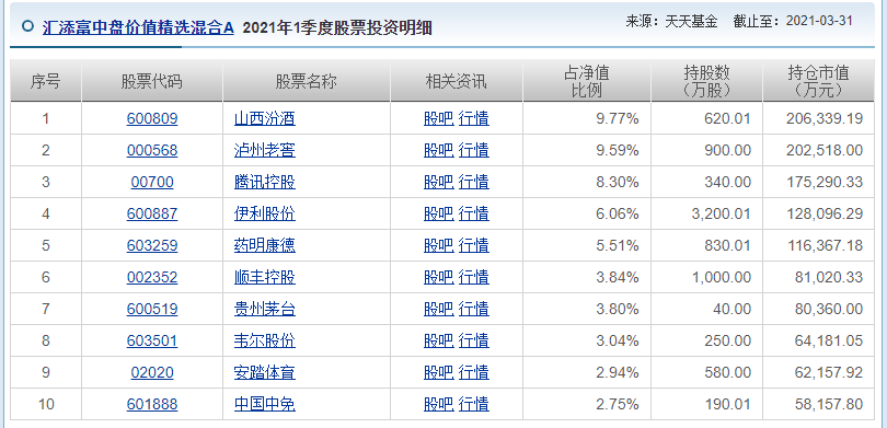 事实上,从2021年1季度开始,山西汾酒(600809.SH)便在这只基金的持仓中排名第一。作为一个以消费股起家的基金大咖,投资组合中怎么可能少得了被汇添富视为“发电厂”的白酒股呢?这也是多位A股基金大咖在投资组合中纳入一定数量港股后,投资回报依然与A股大盘走势近乎同步的根本原因。