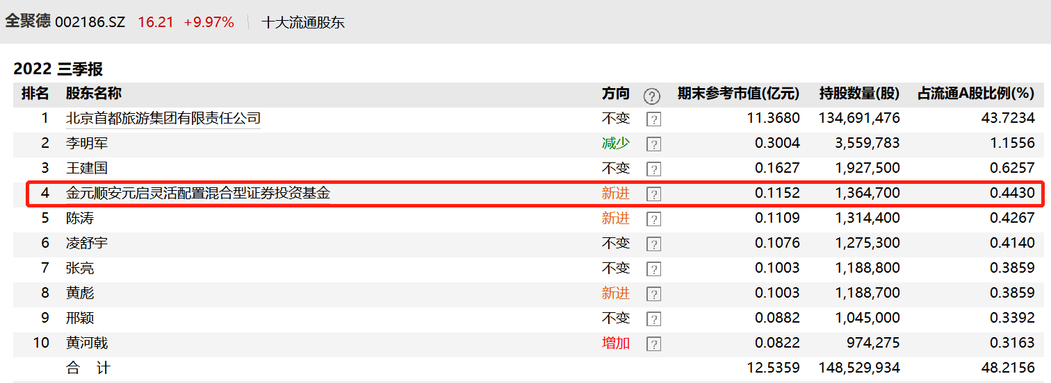 面对平底起飞的全聚德,有哪位基金经理已经成功抄底?全聚德三季报显示,三季度仅有一只公募基金新进成为前十大流通股东——金元顺安元启。三季度,该基金新买入136.47万股全聚德,成为第4大流通股东。