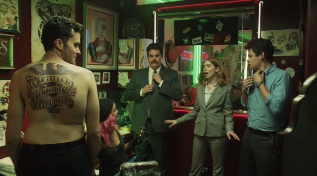 这支广告和人们印象中西装革履的精英会计师画风不太一样。故事设定在一家古巴风格的纹身店:狼狗、彪形大汉、Old School风的内饰、坐在收银台前的花臂少女、纹身针的嗡嗡声——和三个身着西装一脸艳羡地旁观着的年轻人。