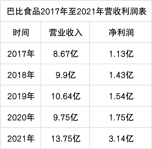 从财务数据看到,巴比馒头从2017年至2021年,每年营收分别为8.67亿、9.9亿、10.64亿、9.75亿和13.75亿,对应的净利润为1.13亿、1.43亿、1.54亿、1.75亿、3.14亿。