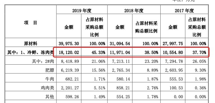 最典型的如猪肉。在巴比食品招股书中的采购列表看到,2017年至2019年,巴比食品采购的冷鲜、冷冻类原材料占比分别为37.7%、38.5%、45.33%。