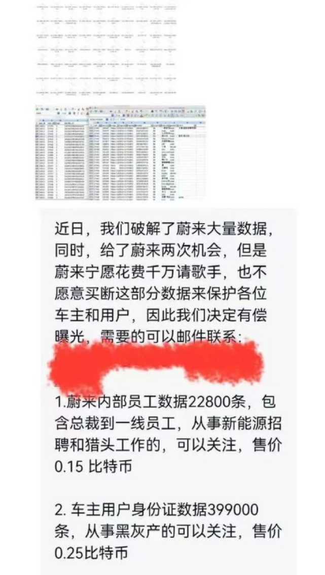 据悉,早在12月11日,蔚来公司便收到外部邮件,对方声称拥有蔚来的内部数据,并以泄露数据对蔚来进行价值225万美元等额比特币的勒索。