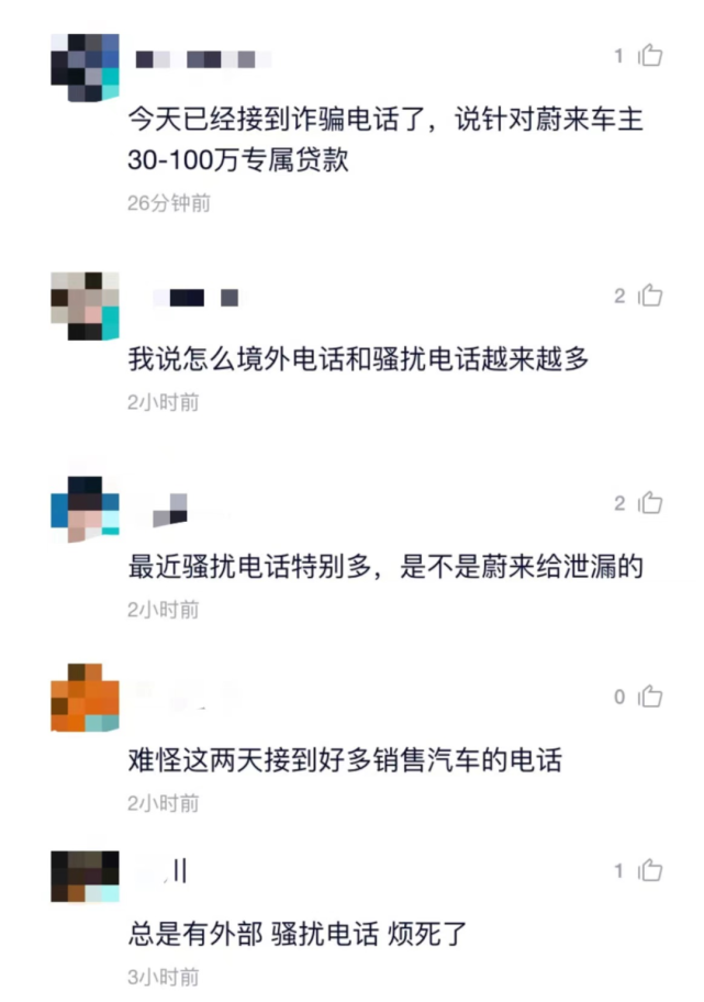 雷达财经注意到,在蔚来社区里,有多位网友反馈称最近接到的骚扰电话较多。甚至有网友称,自己已于12月21日收到诈骗电话,对方称可以为蔚来车主提供30万至100万元的专属贷款。